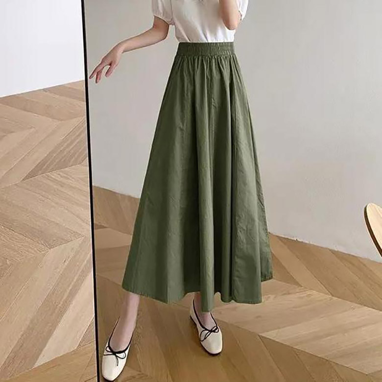 POMTOR 여성 슬림핏 캐주얼 우산치마 하이웨스트 롱 스커트 그린