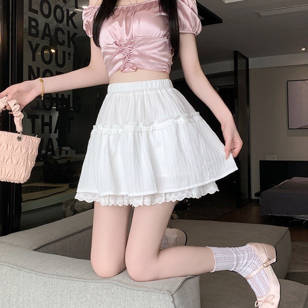 AOKADA 여성 미니 캉캉 스커트 밴딩 하이웨스트 프릴 셔링 A라 숏 치마 흰색 L